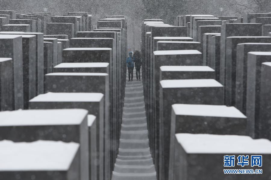 2014年1月27日,在德国首都柏林,两名游客走过犹太人纪念碑群。 新华社记者张帆摄 (张晨岑编辑)