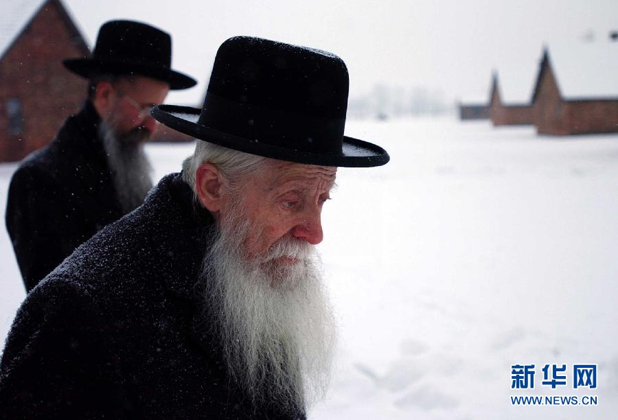 2005年1月25日,在波兰南部的奥斯威辛集中营遗址,一名犹太幸存者(前)在同伴的陪同下,缅怀奥斯威辛集中营的遇难者。 新华社记者吴晓凌摄 (张晨岑编辑)