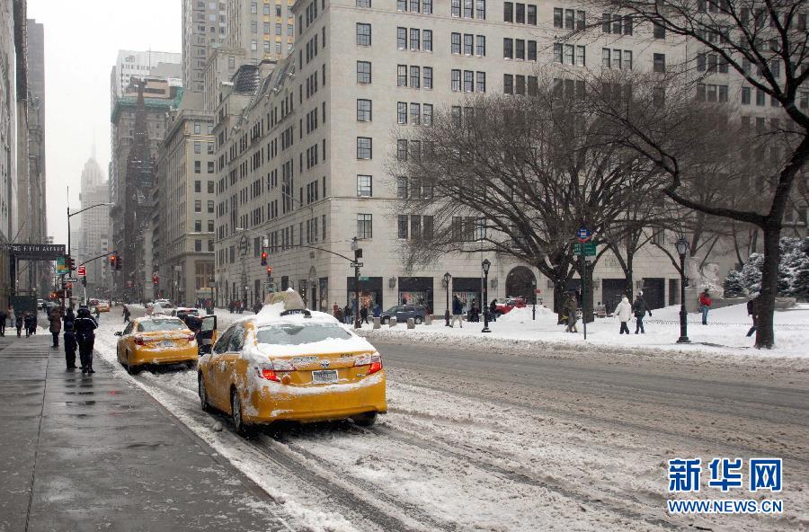 1月27日,美国纽约曼哈顿第五大道上车辆稀少。一场罕见的暴风雪26日肆虐美国东北部,纽约、新泽西、康涅狄格、罗得岛、马萨诸塞和新罕布什尔等6个州已宣布进入紧急状态,纽约市封城,全美6000万人受到影响。新华社记者 吴瑕 摄