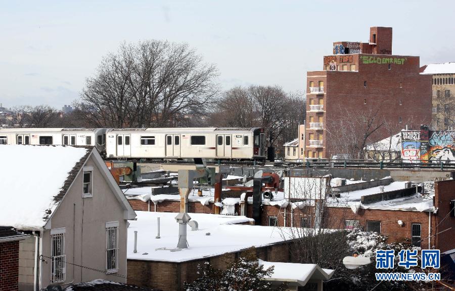 1月27日,一列地铁列车驶过美国纽约皇后区。一度停运的纽约地铁当日晨逐渐恢复运行。一场罕见的暴风雪26日肆虐美国东北部,纽约、新泽西、康涅狄格、罗得岛、马萨诸塞和新罕布什尔等6个州已宣布进入紧急状态,纽约市封城,全美6000万人受到影响。新华社记者 吴瑕 摄