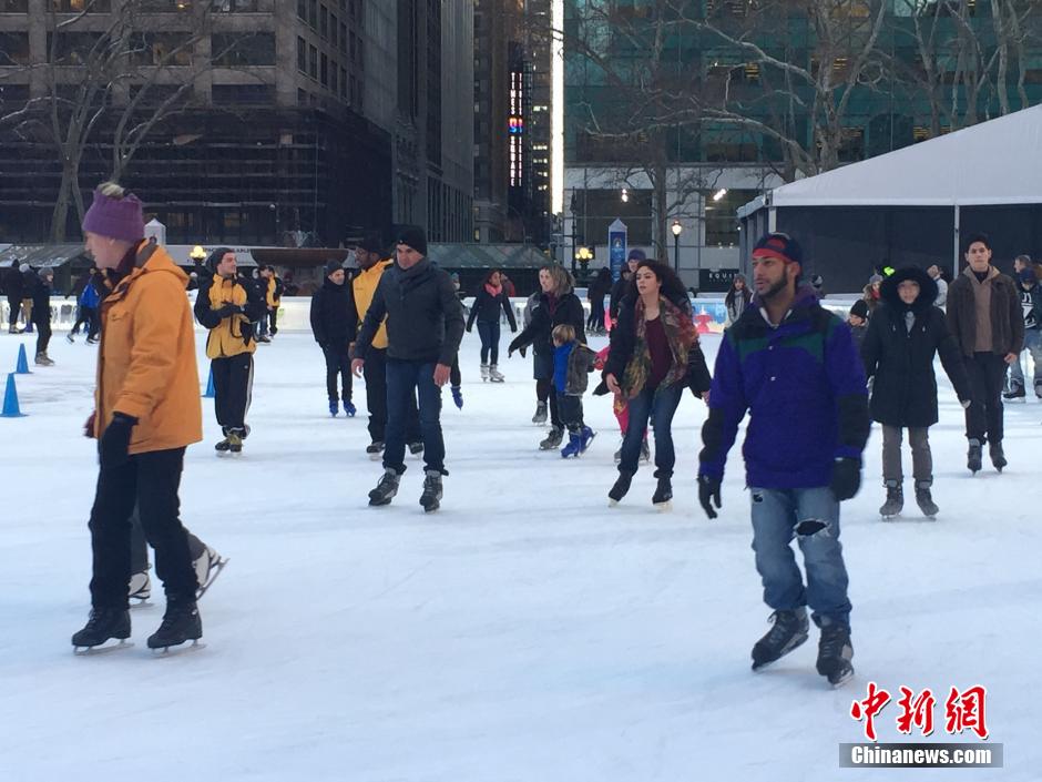1月28日,暴风雪肆虐后的纽约雪后初晴,公园重新开放,图为纽约市民在第五大道附近的布莱恩特公园滑冰。中新社发 邓敏 摄