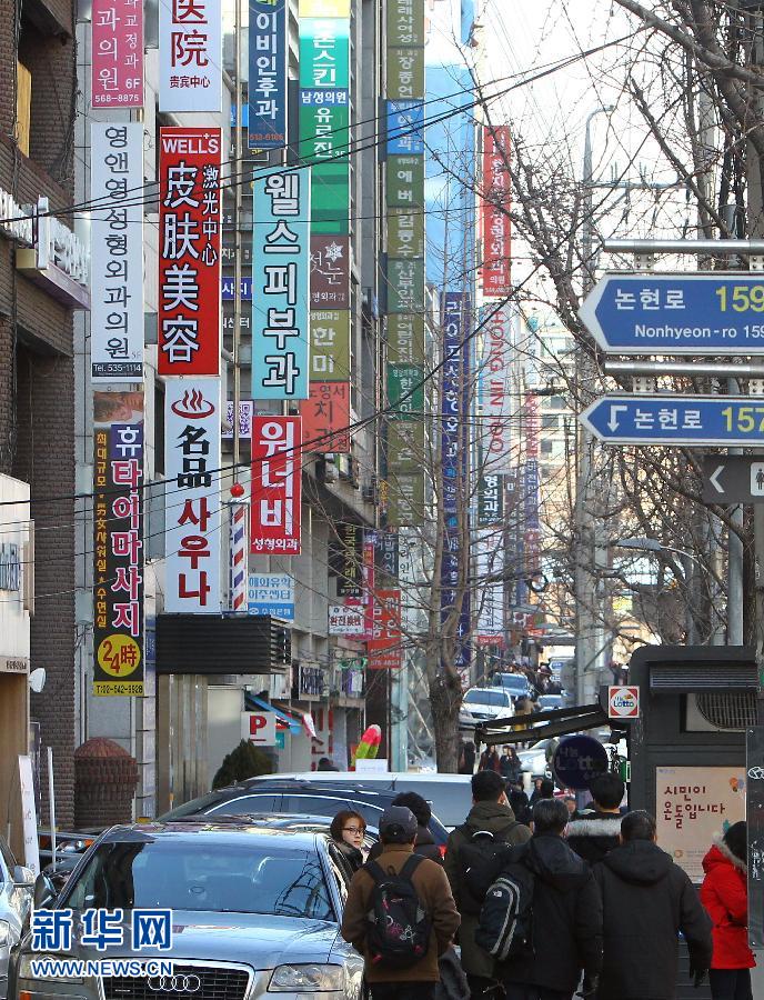 2月2日,行人从韩国首尔狎鸥亭附近的整容医院前经过。位于韩国首尔狎鸥亭地铁站附近有一条著名的整容街。在方圆不到两公里的区域内,密密麻麻地分布着200多家整容医院。这里甚至被韩国媒体称为“整容王国”的中心。近年来,受“韩流”影响,中国赴韩整容人数激增,成为来韩整容外国人中的主力军。然而由于韩国整容行业良莠不齐,夸大宣传、手术不规范的现象层出不穷,国人赴韩整容纠纷不断增多。近日,一名中国女性在韩国接受整容手术时脑死亡的事件,再次引发人们对赴韩整容安全性的关注。新华社记者姚琪琳摄