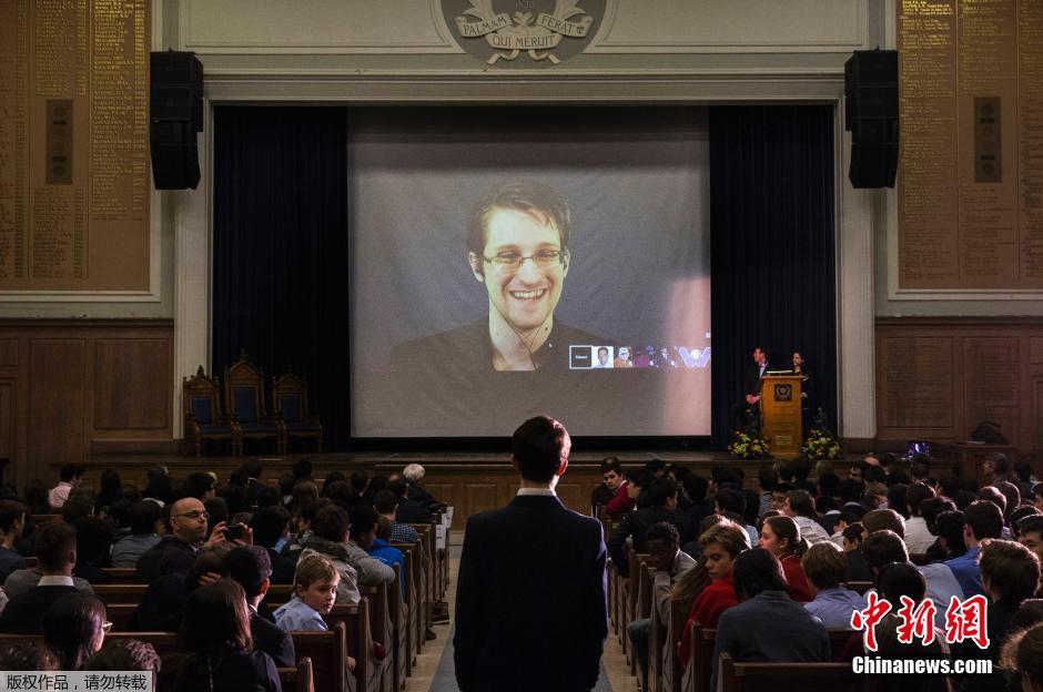 当地时间2月2日,多伦多,应一名加拿大高中生的请求,美国中情局前雇员爱德华·斯诺登通过视频方式参与了一场中学会议,向学生们讲述了自己对棱镜门事件的看法。据悉会议有超过1000名学生到场聆听,斯诺登通过视频连线做了发言。