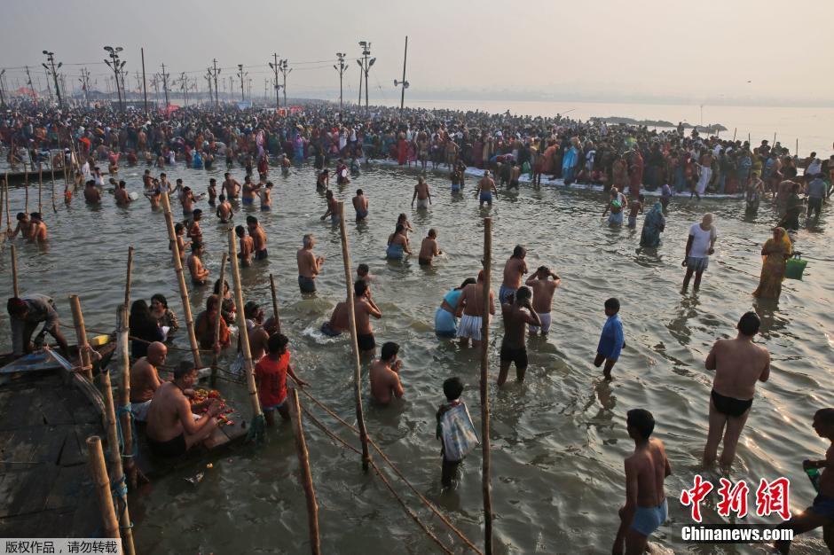 当地时间2015年2月3日,印度阿拉巴哈德,印度民众持续庆祝佛浴节,信众在河中洗圣浴,并点灯举行宗教仪式。