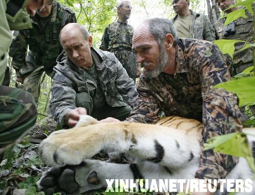 2008年8月31日,在俄罗斯远东地区,普京在科学家的帮助下为一只5岁的老虎戴上项圈。普京当日访问西伯利亚虎保护区时,一只掉入陷阱的西伯利亚虎突然蹿出,扑向附近的摄影师们,普京抓过一把用于麻醉的气枪射击,射中老虎肩胛处。虎中弹入睡后,普京亲手为虎戴上装备全球定位系统的项圈,以便科研人员监控它的动向和健康状况。