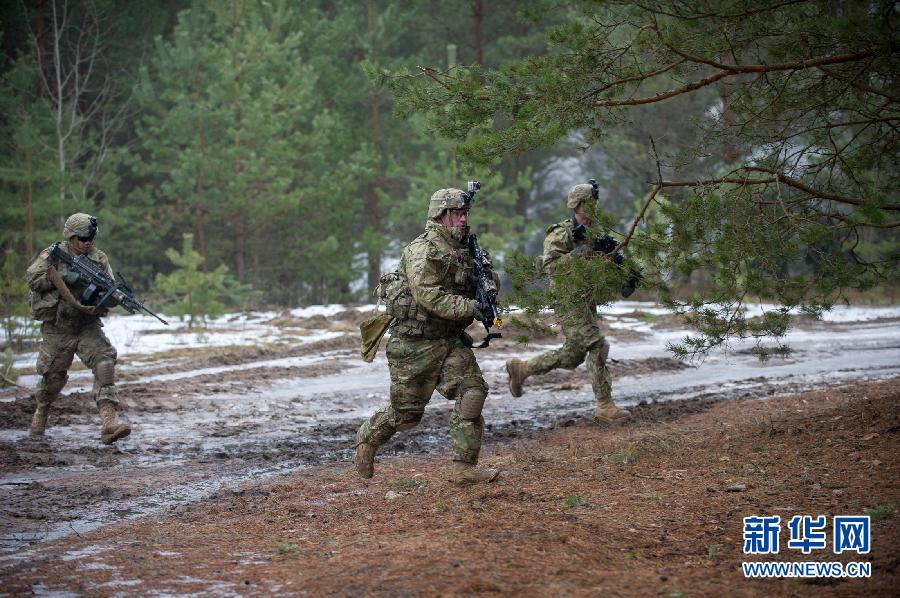 2月25日在立陶宛帕布拉德拍摄的立陶宛和美国部队联合训练现场。 新华社发(阿尔弗雷达斯·普里亚迪斯摄)
