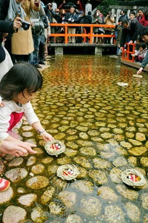 据日本媒体报道,3月3日是日本的“女孩节”(又称桃花节)。这天,日本京都市左京区的下鸭神社举行了祈祷孩子们健康茁壮成长的“放浮舟”仪式,将和纸制成的人偶放进稻草扎成的小圆船里,顺水漂流。