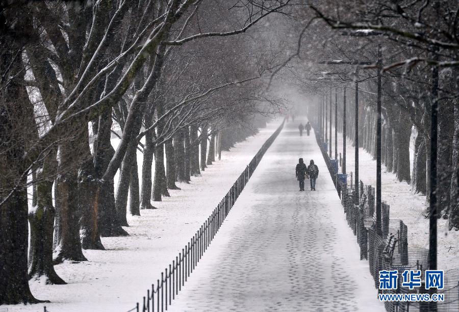 3月5日,在美国首都华盛顿,人们冒雪前行。当日,华盛顿遭遇入冬以来最强的一次暴风雪,气象部门预计降雪厚度将达20厘米。大雪导致华盛顿地区数百架航班取消,当地政府部门和学校放假一天。新华社记者殷博古摄