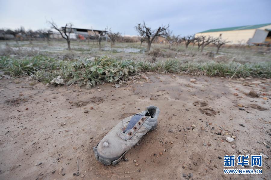 这是3月9日在西班牙萨拉戈萨省拍摄的洪水消退后的农田。受连续强降雨和融雪影响,西班牙埃布罗河流域自2月底以来遭洪水侵袭,数千民众被迫疏散。 新华社记者谢海宁摄