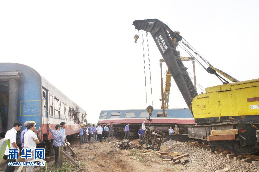 3月11日,在越南中部广治省,工作人员清理撞车事故现场。