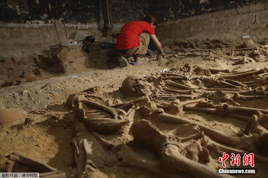 当地时间2015年3月10日,法国巴黎,考古学家在墓地工作。考古工作者与建筑工人一起掘开法国巴黎市中心的一家“不二价”超市的底部时,发现令人震惊的一幕,200余具人类尸骨排列整齐地被埋藏在地下,专家推测他们死于中世纪的黑死病。根据初步发掘,这个墓地由8个墓室组成,其中,7个墓室各埋有5至20具左右的尸骨,剩下的1处墓室则堆积了超过150具尸骨。而最令人惊讶的是,这些尸体并不是被简单丢弃的,所有遗骸头脚相接排列整齐,很显然是为了节约空间。