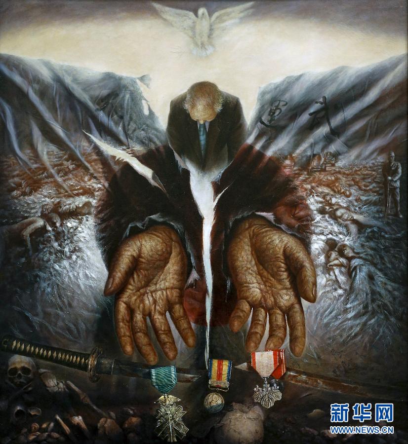3月31日在比利时首都布鲁塞尔拍摄的《谁能给我们和平——纪念二战胜利70周年国际和平艺术家绘画作品展》参展作品。当日,欧洲议会、国际和平艺术家联盟、中国对外文化交流协会、欧洲中国文化教育基金会等机构在欧洲议会大厦共同举办《谁能给我们和平——纪念二战胜利70周年国际和平艺术家绘画作品展》。新华社记者周磊摄