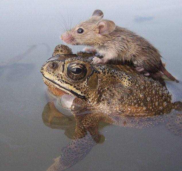 在印度北部勒克瑙的一个池塘里,一只挣扎着浮在水上的老鼠被一只友情青蛙运送到岸边的情景。摄影师阿扎姆·胡赛因及时抓拍到这一过程。