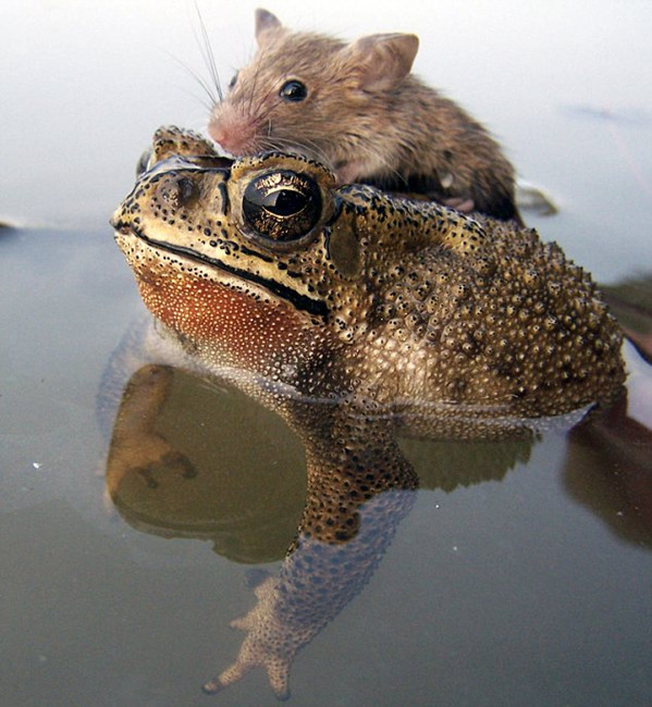 在印度北部勒克瑙的一个池塘里,一只挣扎着浮在水上的老鼠被一只友情青蛙运送到岸边的情景。摄影师阿扎姆·胡赛因及时抓拍到这一过程。