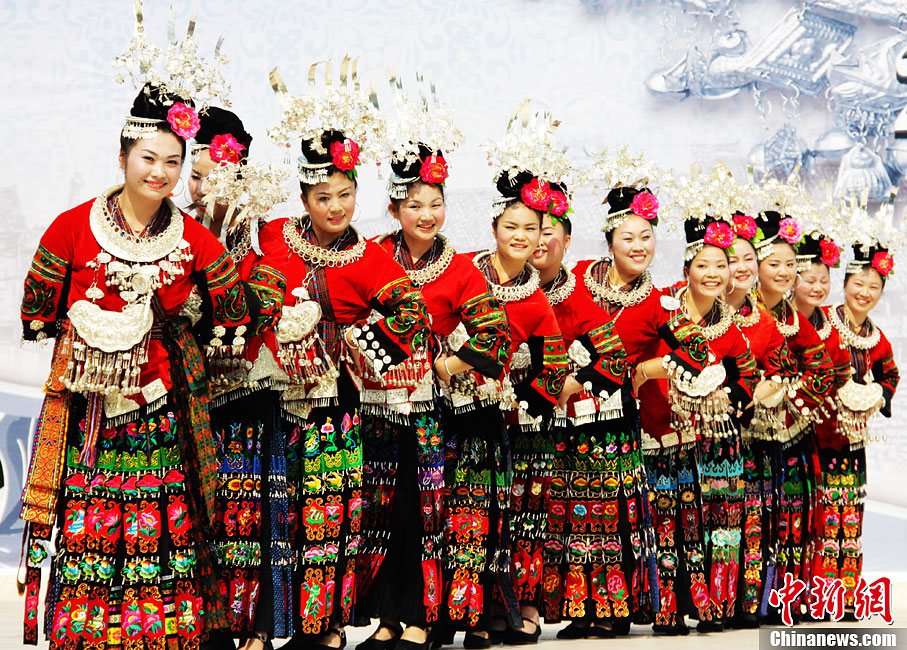 10月13日,中国凤凰第四届苗族银饰服饰文化节在凤凰古城开幕,由来自湖南、广西、云南和贵州四省苗族聚居区的苗族同胞组成的17支代表队,身着苗族特色服饰演出,比拼苗族银饰服饰之美。中新社发 唐小晴 摄