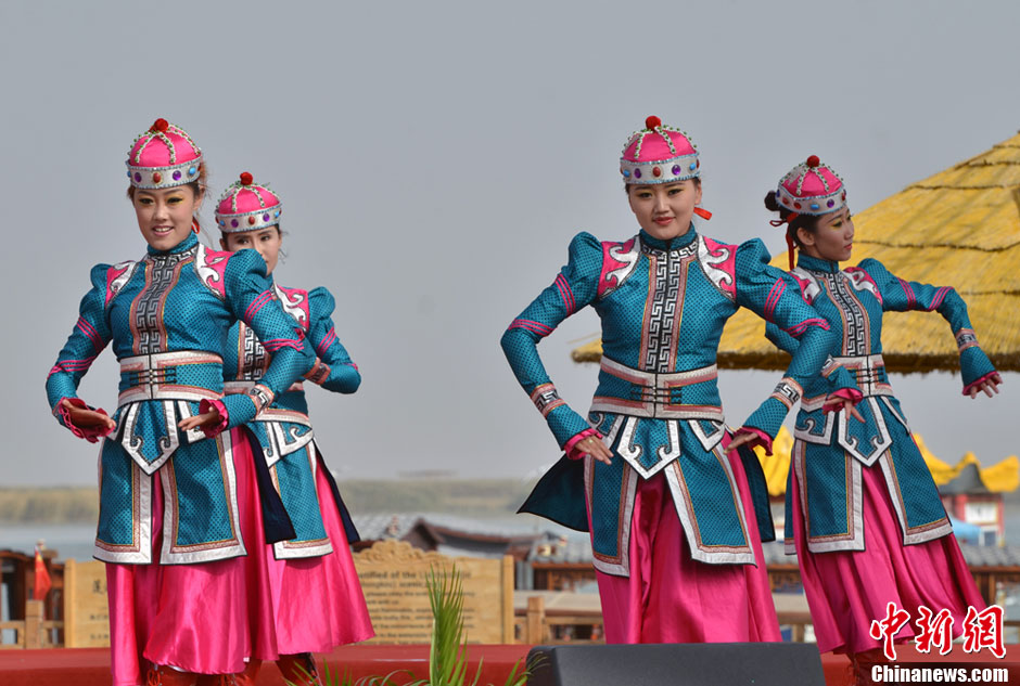 10月18日,新疆·博湖第三届国际芦苇文化艺术节在该县莲海世界景区举行。图为新疆博湖县当地舞蹈演员在表演传统舞蹈沙吾尔登《走马》。孙亭文 摄