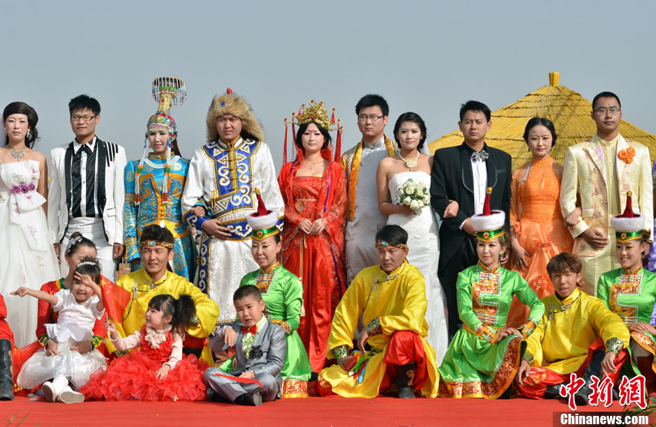 10月18日,新疆·博湖第三届国际芦苇文化艺术节在该县莲海世界景区举行。图为开幕式上的婚礼服饰秀。孙亭文 摄