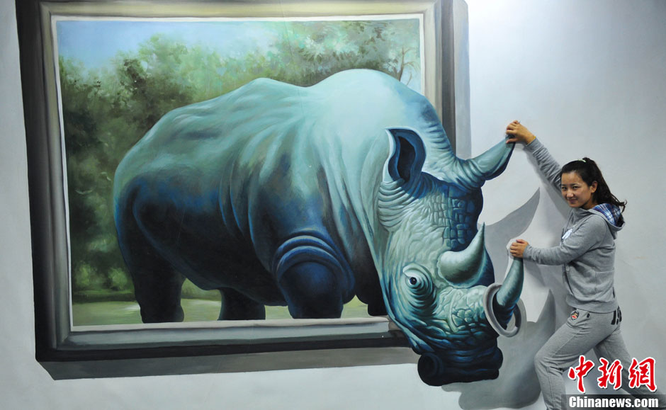 10月19日,沈阳市民在3D魔幻艺术画展上拍照。当日,3D魔幻艺术画展亮相沈阳,吸引了众多市民前来拍照留念。中新社发 于海洋 摄