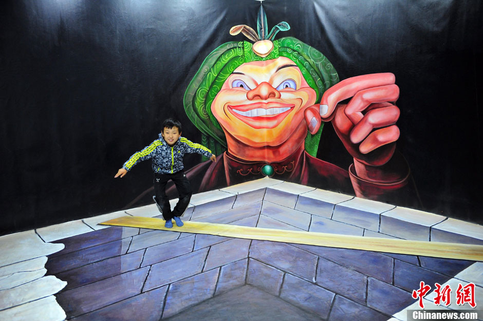 10月19日,沈阳市民在3D魔幻艺术画展上拍照。当日,3D魔幻艺术画展亮相沈阳,吸引了众多市民前来拍照留念。中新社发 于海洋 摄