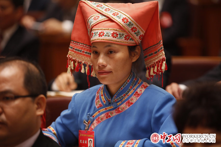 中国工会第十六次全国代表大会10月18日在北京人民大会堂开幕。图为少数民族代表盛装出席。   中工网记者 韩靖 摄