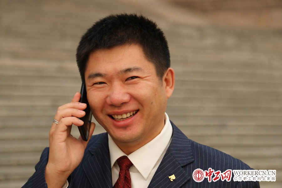来自中国劳动关系学院劳模班的学员、全国劳模、中国兵器工业集团公司东北工业集团吉林江机公司数控车班组长王岩作为工会十六大特邀代表参加开幕式,在要进入人民大会堂前拨通了妻子的电话,他把自己此时此刻的兴奋之情告诉妻子,也表达这么多年家人的支持。中工网记者 郭晨 摄