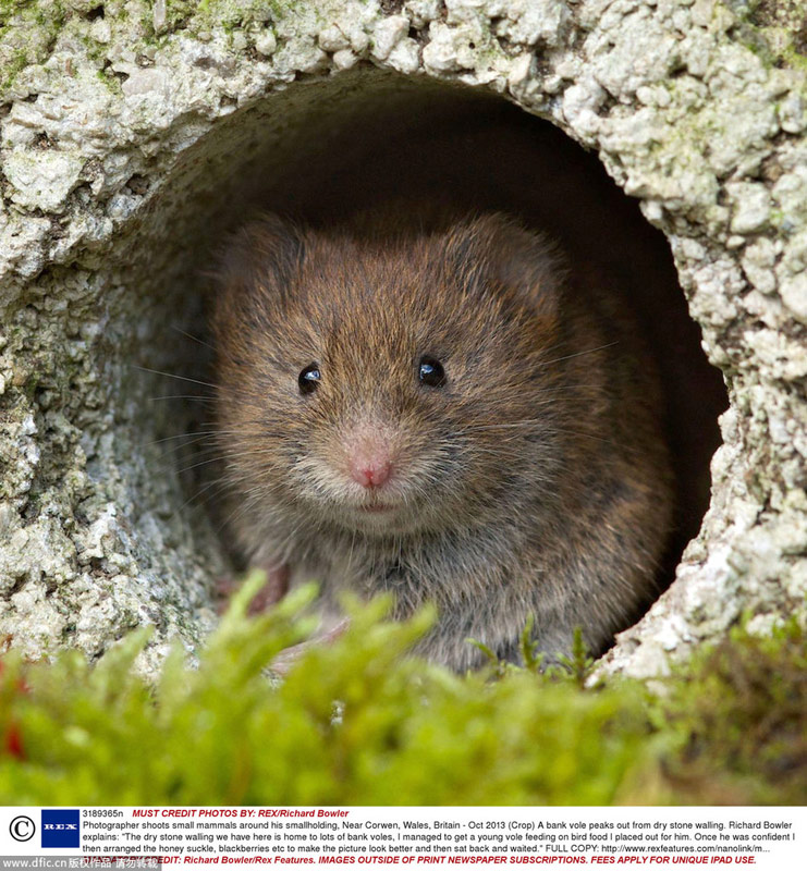 当地时间2013年10月15日报道,英国威尔士的摄影师Richard Bowler非常热衷于拍摄小型啮齿类哺乳动物:换言之就是鼠类的照片。平时遭人人喊打的老鼠到了它的镜头下反而显得格外可爱。据Richard所说,要给它们拍照可不是件容易的事,因为鼠类都是十分警惕的。他家的后墙里住了不少的田鼠和林鼠,而为了将它们引出洞来,他要精心布置食物作诱饵,并且向它们表达自己是无害的,任何一个大幅度的动作都可能吓跑这些老鼠们。当安排大功告成后,最后需要做的就是静静等待了。据悉Richard花了两周才拍齐这几张照片。