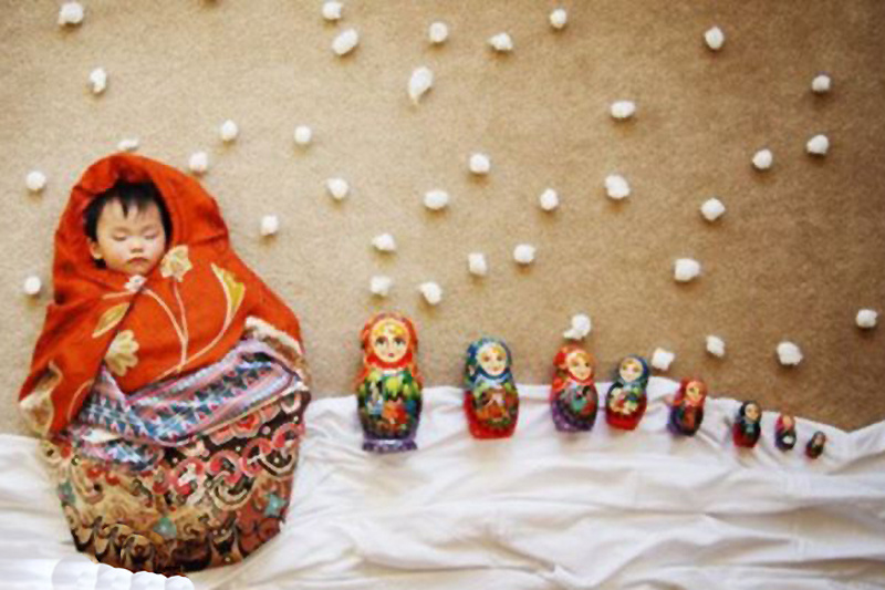 廖女士讲到,每天在Wengenn睡之前,她就把他想象成故事中的主角,然后像艺术家绘制背景一样用一些普通衣服、毛绒玩具和其他一些普通的家具材料制作场景,等Wengenn睡着以后就开始拍摄。这些照片中有一张把宝宝扮成天使,旁边还有“为日本祈福”字样,意在为发生海啸和地震的日本祈祷。