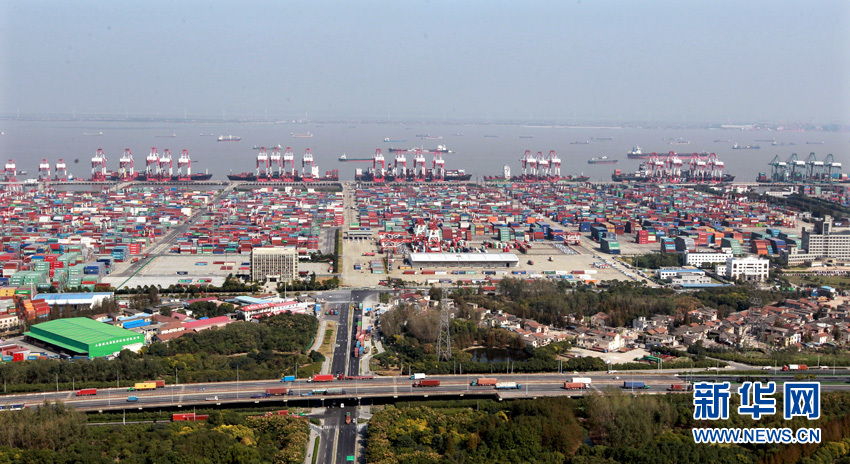 这是在警航巡逻直升机上拍摄的上海自贸区外高桥集装箱码头(10月29日摄)。新华社记者凡军摄