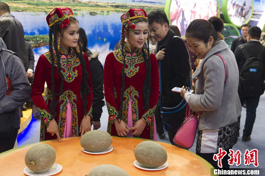 10月31日,两名身着少数民族传统服装的新疆姑娘推介当地水果,引起观展民众关注。中新社发 崔楠 摄
