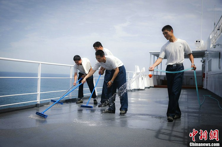 图为6月15日,和平方舟的战士正清扫舱面。中新社发 张浩 摄