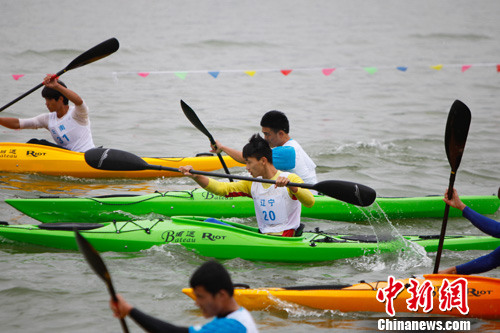 11月3日,2013年全国青年皮划艇马拉松大奖赛第二天,男子组竞争异常激烈,据了解,全程10公里的水上“马拉松”划行里程在全国尚属首次。全国青年皮划艇马拉松大奖赛2日在云南省丘北县普者黑景区举行,来自全国多个省市的60多名皮划艇选手进行为期2天的角逐。中新社发 任东 摄