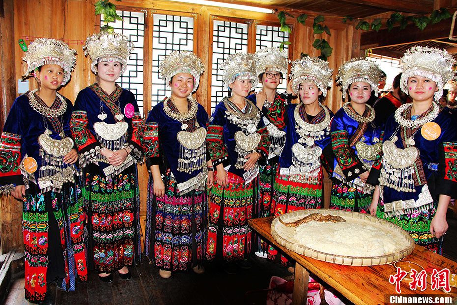 11月8日至12日,贵州雷山苗族同胞迎来一年一度的苗年,期间西江千户苗寨举办以“牵手西江·地久天长”为主题的集体婚礼,66对“新人”按照苗族传统婚礼形式喜结良缘。据了解,集体婚礼分五个乐章进行,分别是“西江婚礼——神秘莫测的苗族偷亲”、“西江金婚·对爱的执著”、“舞动西江·激情飞扬”、“我们的幸福·我们的爱”以及“婚姻的誓言·责任”。图为美丽的“苗族新娘”。中新社发 李雪 摄