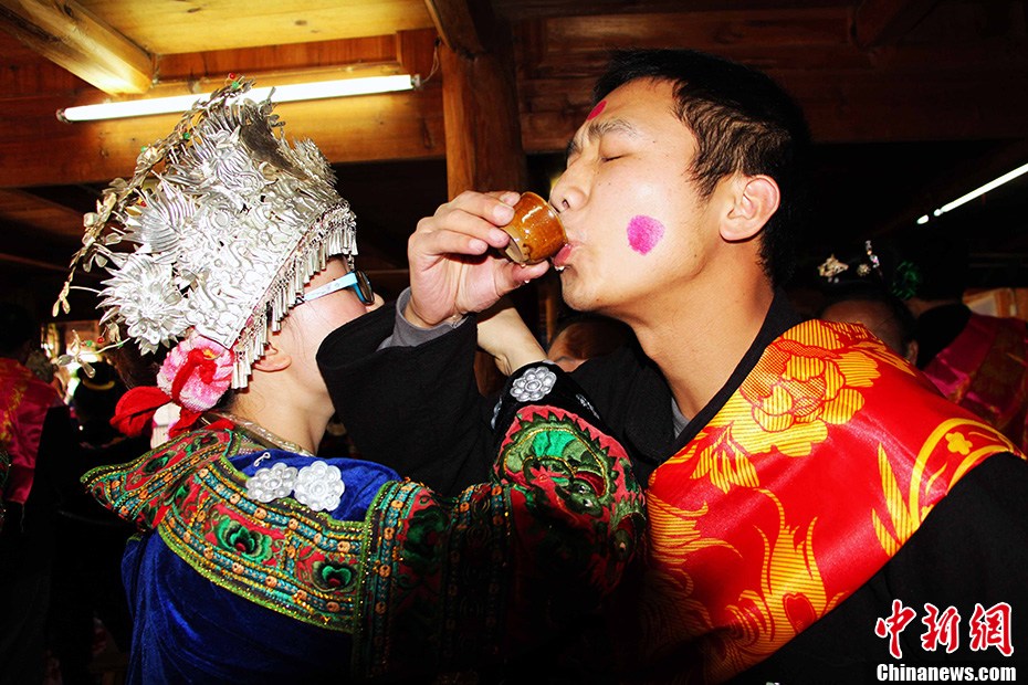 11月8日至12日,贵州雷山苗族同胞迎来一年一度的苗年,期间西江千户苗寨举办以“牵手西江·地久天长”为主题的集体婚礼,66对“新人”按照苗族传统婚礼形式喜结良缘。据了解,集体婚礼分五个乐章进行,分别是“西江婚礼——神秘莫测的苗族偷亲”、“西江金婚·对爱的执著”、“舞动西江·激情飞扬”、“我们的幸福·我们的爱”以及“婚姻的誓言·责任”。图为新郎新娘喝交杯酒。中新社发 李雪 摄