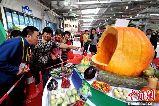 11月18日,通过航天育种培育出的特大南瓜亮相海峡两岸花博会,吸引了参观者眼球。当日,第五届海峡两岸现代农业博览会·第十五届海峡两岸花卉博览会在福建漳州举行。中新社发 王东明 摄