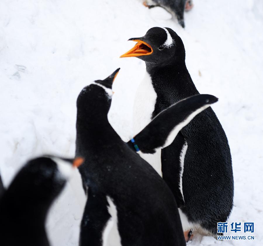 11月22日,两只企鹅在户外的雪堆上“争吵”。连日的暴雪使哈尔滨极地馆外堆积了厚厚的白雪,馆里一些来自南极的企鹅走到户外,享受“回归”家乡的自然感觉。 新华社记者 王凯 摄