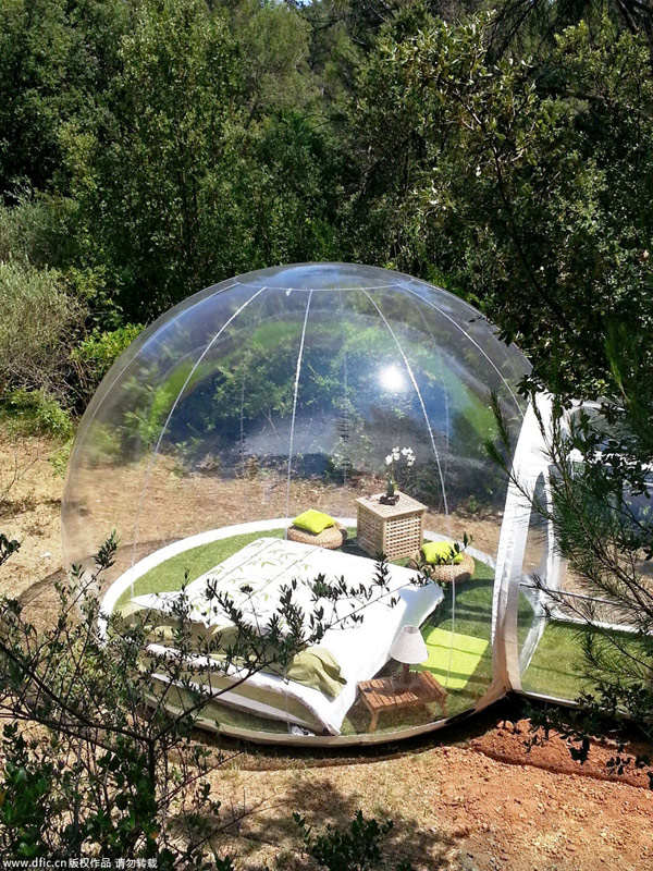 当地时间2013年10月31日报道,法国,出门旅游,必定要考虑住在哪里,星级饭店?还是经济型旅馆?喜欢露营的人会自带帐篷,和大自然来个零距离接触。也许很快,人们又会多一个选择,这就是,充气气泡旅馆。由设计师Pierre-Stéphane Dumas设计,可以更好得与大自然绿森林生活,也能让繁忙于工作的人更亲近山中,抒发平日紧张的压力,当你躺在床上就彷佛被自然景色包围!泡泡旅馆测量直径为13英尺,其中大多数是完全透明的,这一概念是由法国设计师创建的一个简单的目标,创建生态友好的空间。一旦泡沫被折迭起来,自然保持完整。气泡高3米,宽4米。除了半透明的圆形房间,还有一个小小的走廊。房间里没有卫生间和其他普通建筑里都配备的设施。气泡的形状靠空气的不断流动来保持。气泡旅馆老板说:“我们的目的就是让人融入大自然。实际上这是一块保留地,在这里你可以不受任何人打搅,完全沉浸在自己的思想中,或者和最亲密的人一起享受这里的宁静。