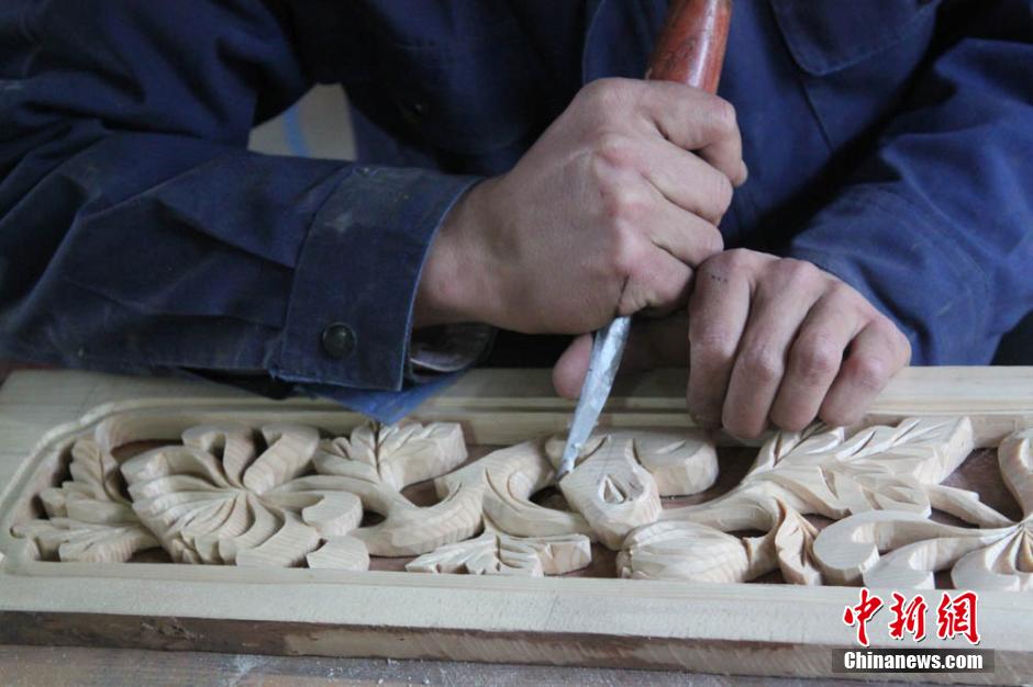 图为工人正在雕刻图案。刘玉桃 摄