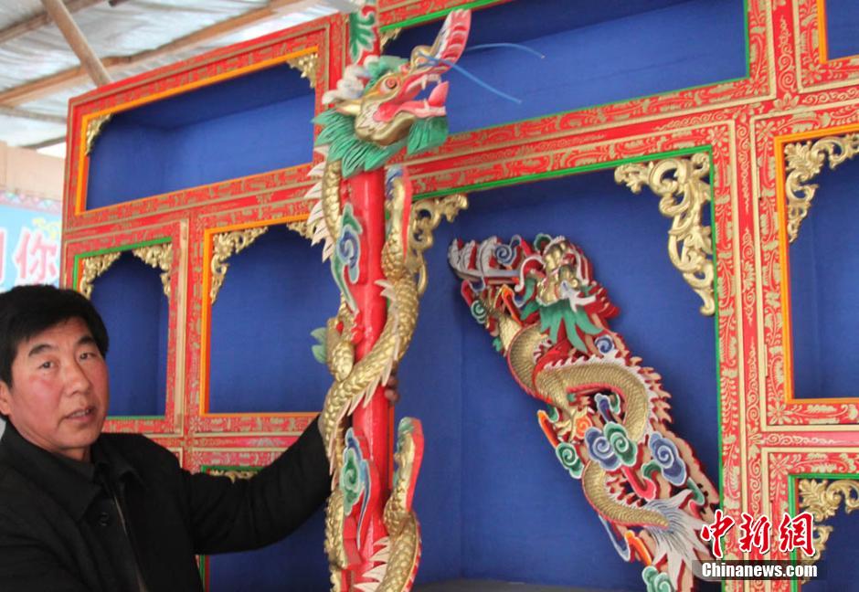 图为李英来和他雕刻彩绘的“龙”图案。刘玉桃 摄