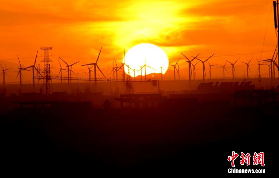 12月1日,甘肃省玉门市地面风电场的风机与夕阳晚霞相映成趣。当日傍晚,甘肃省玉门市在落日余晖的映衬下显得格外美丽,令人陶醉其中。万宗平 摄