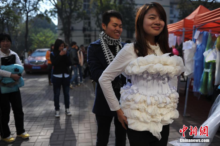 12月2日,安徽农业大学“绿色家园”环保志愿者用身边废物制作成各种礼服,在校园内进行服装走秀,倡议环保。中新社发 张娅子 摄