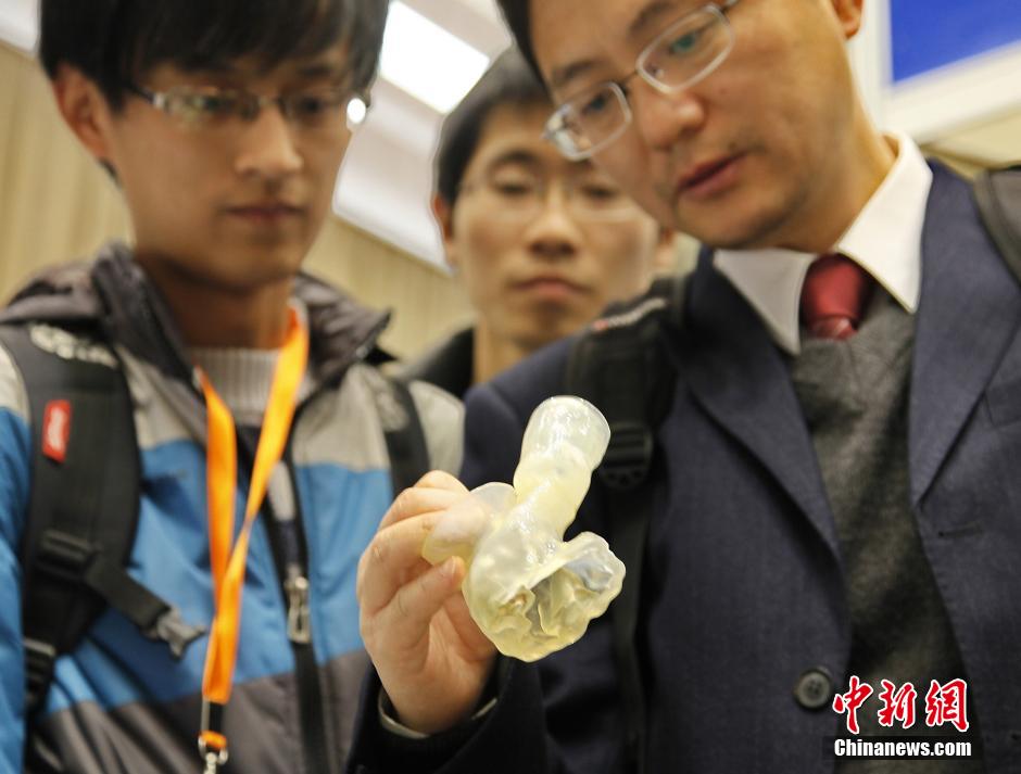 12月3日,为期两天的2013上海国际3D打印技术暨快速成型展览会在上海国际会议中心举行。本次展览集结了包括美国、德国、比利时、新加坡等46家国内外众多3D打印龙头企业,共设立展位71个,集中展示了3D打印的最新产品和技术。小到个性物品,大到飞机部件,甚至到生物组织都能在本次展览会上见到。本次活动是目前国内3D打印技术展规模最大、专业性最强的。图为观众在一展位前仔细观察将运用到未来医药领域的3D打印动脉配件。中新社发 袁婧 摄
