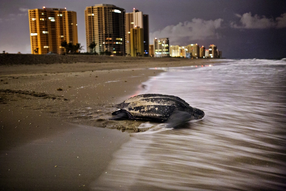 美国佛罗里达州东南部的棕榈滩县是整个北美洲重要的海龟产卵及孵育场所之一,每年都有许多海龟在夜幕中爬上沙 滩产卵,繁殖下一代。摄影师Greg Lovett及其摄影团队抵达棕榈滩县,不顾漫漫黑夜里海风吹打,用相机记录下产卵季节里成年海龟以及 刚刚孵化出海龟幼仔的照片。