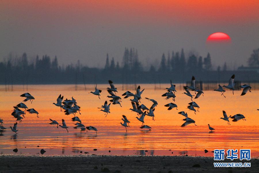 12月4日,一群反嘴鹬在湖南东洞庭湖国家级自然保护区振翅齐飞。据该保护区监测数据显示,至2013年11月底,抵达东洞庭湖湿地越冬的候鸟已达55种、10万只左右。东洞庭湖国家级自然保护区位于湖南省岳阳市境内,面积约19万公顷,1994年成为国家级自然保护区,主要保护对象为湿地和珍稀鸟类。新华社发(彭斌 摄)