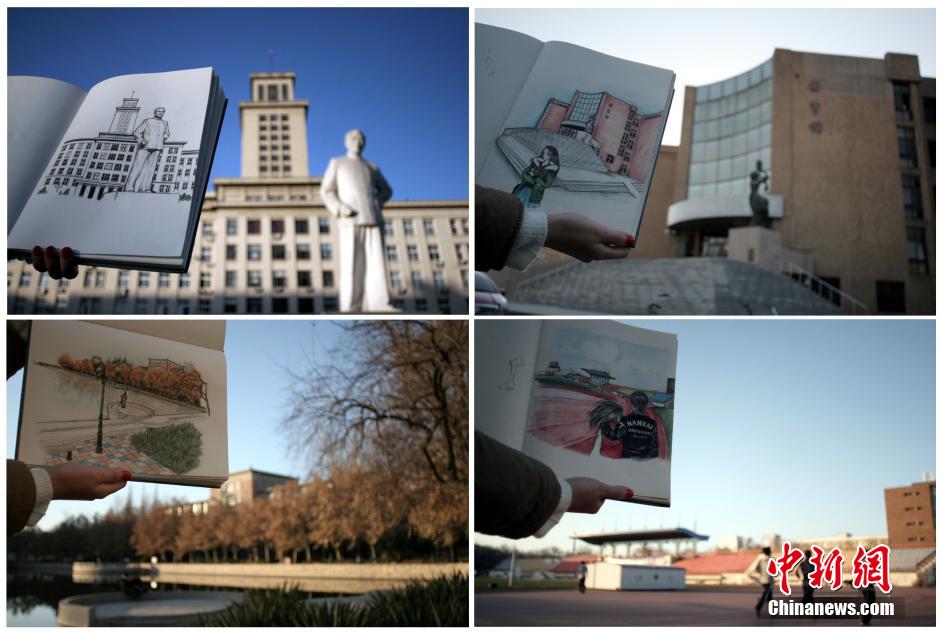 12月5日,“南开微爱”手绘系列明信片原稿与校园实景的对比。近日,南开大学2012级周恩来政府管理学院学生朱梦用彩色铅笔创作的“南开微爱”系列明信片在网络上引起众多追捧,她用一支支彩色铅笔绘出校园内不同季节及时间的特色风景,勾起许多南开人对曾经校园生活点点滴滴的回忆。中新社发 佟郁 摄