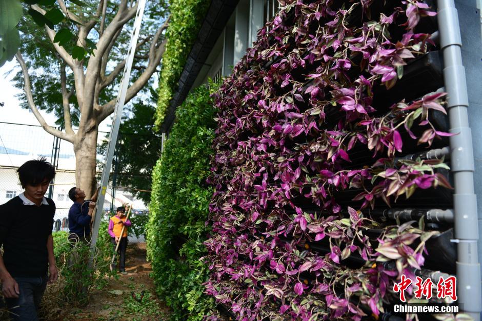 12月7日,厦门体育中心附近的公的外墙密密麻麻地挂满了小花盆,让人眼前一亮。据了解,厦门市绿化管理中心近期对3个试点公厕的墙面进行垂直绿化改造。垂直绿化选取了红贵妃、红花仙草、鸭仔草等多个品种的植物,通过对墙面进行壁面绿化,可以缓和建筑的生硬度。吕明 摄