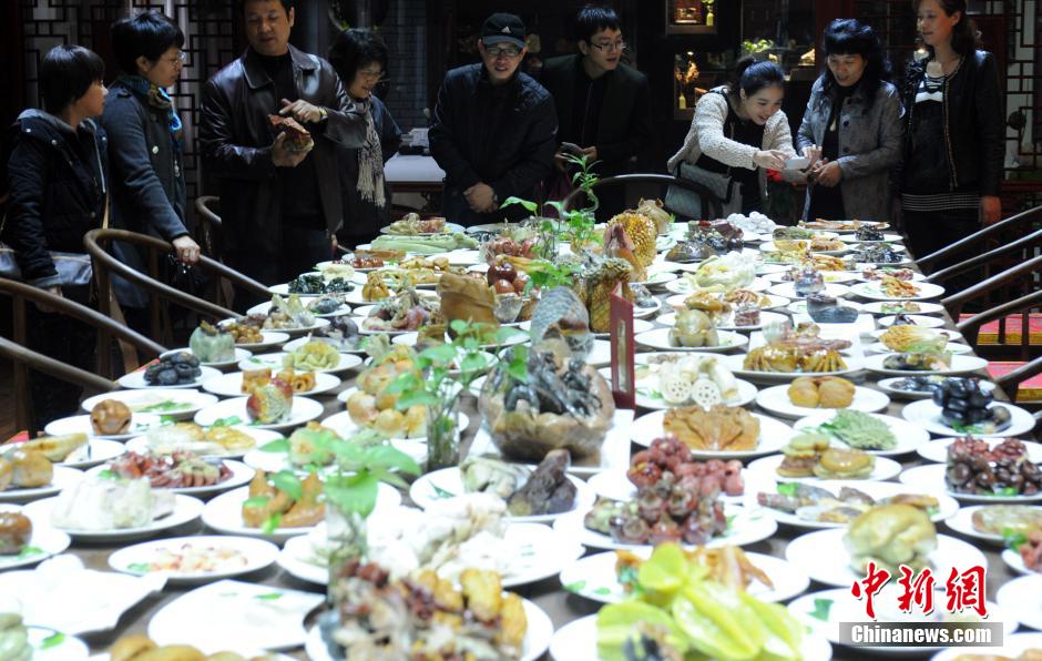 12月7日,由福州寿山石雕刻艺术家孙兆勇历时近20年潜心收集、创作,利用月尾石、善伯冻、艾叶绿、老岭石、芙蓉石、杜陵石等几十种寿山石雕刻创作而成的 “寿山石满汉全席”143道“菜肴”等,获得由上海大世界吉尼斯总部颁发的大世界吉尼斯之最证书。刘可耕 摄