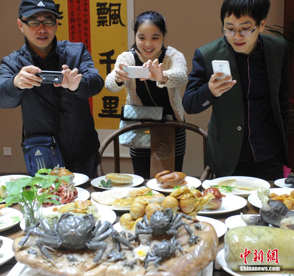 12月7日,由福州寿山石雕刻艺术家孙兆勇历时近20年潜心收集、创作,利用月尾石、善伯冻、艾叶绿、老岭石、芙蓉石、杜陵石等几十种寿山石雕刻创作而成的 “寿山石满汉全席”143道“菜肴”等,获得由上海大世界吉尼斯总部颁发的大世界吉尼斯之最证书。刘可耕 摄