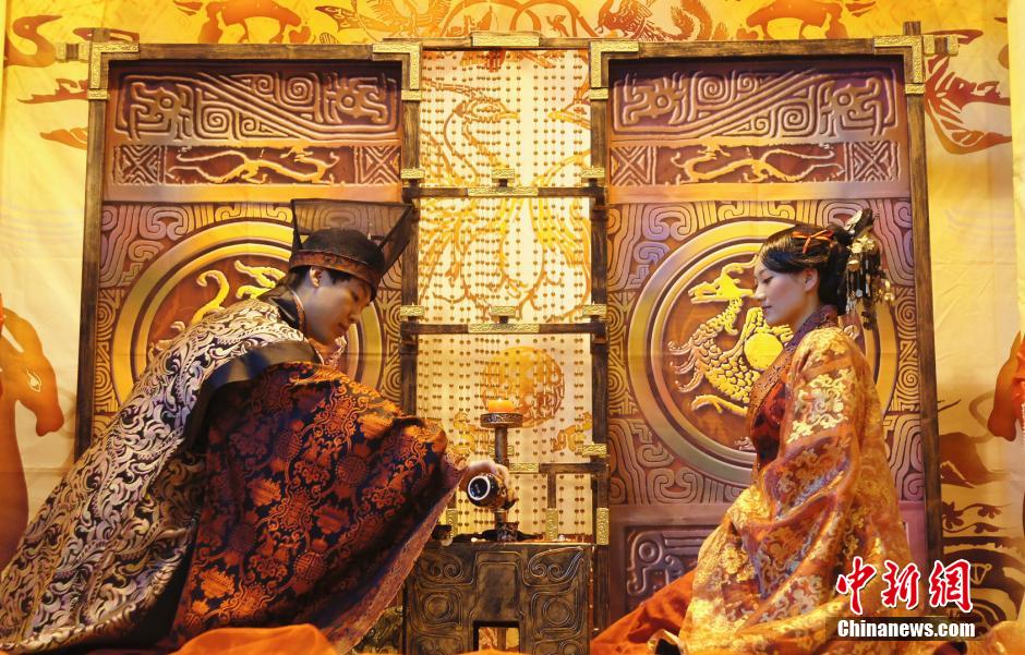 近年来,钟爱汉式婚礼模式的年轻人和家族越来越多。据京城专业运作汉式婚礼的创始人汉衣坊主介绍,汉式婚礼即汉民族的传统婚礼,历经多个历史朝代的积蕴,具有丰富的文化内涵。图为2013年9月28日,在北京福源花园举办的汉式婚礼。中新社发 王超 摄