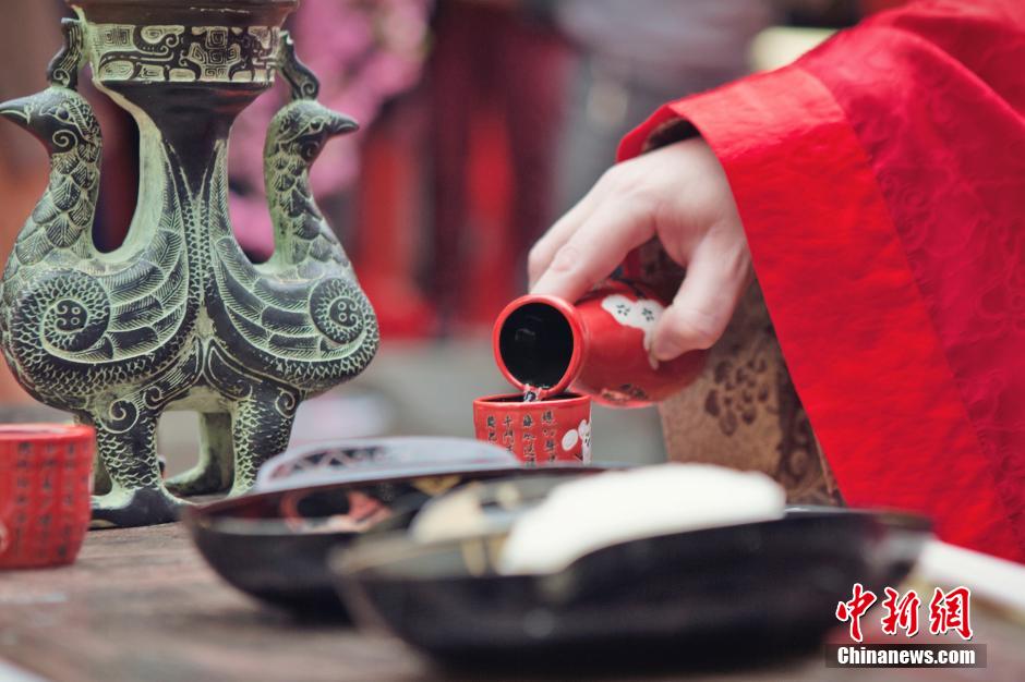 近年来,钟爱汉式婚礼模式的年轻人和家族越来越多。据京城专业运作汉式婚礼的创始人汉衣坊主介绍,汉式婚礼即汉民族的传统婚礼,历经多个历史朝代的积蕴,具有丰富的文化内涵。图为2013年10月13日,在北京北海仿膳举办的汉式婚礼,新郎是一名外国人。中新社发 王超 摄