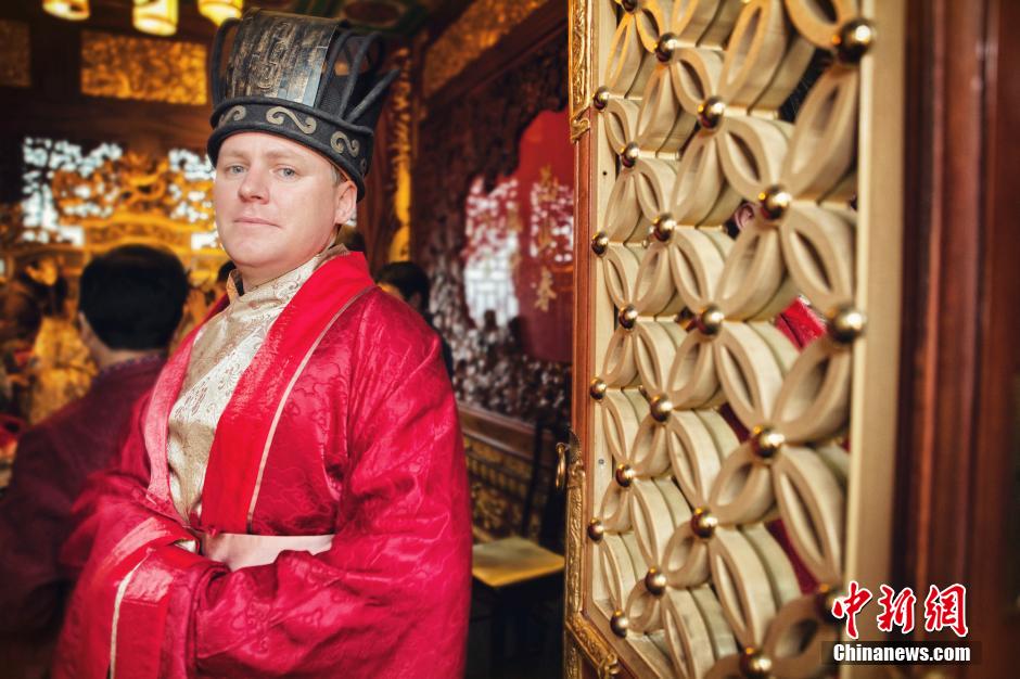 近年来,钟爱汉式婚礼模式的年轻人和家族越来越多。图为2013年10月13日,在北京北海仿膳举办的汉式婚礼,新郎是一名外国人。中新社发 王超 摄
